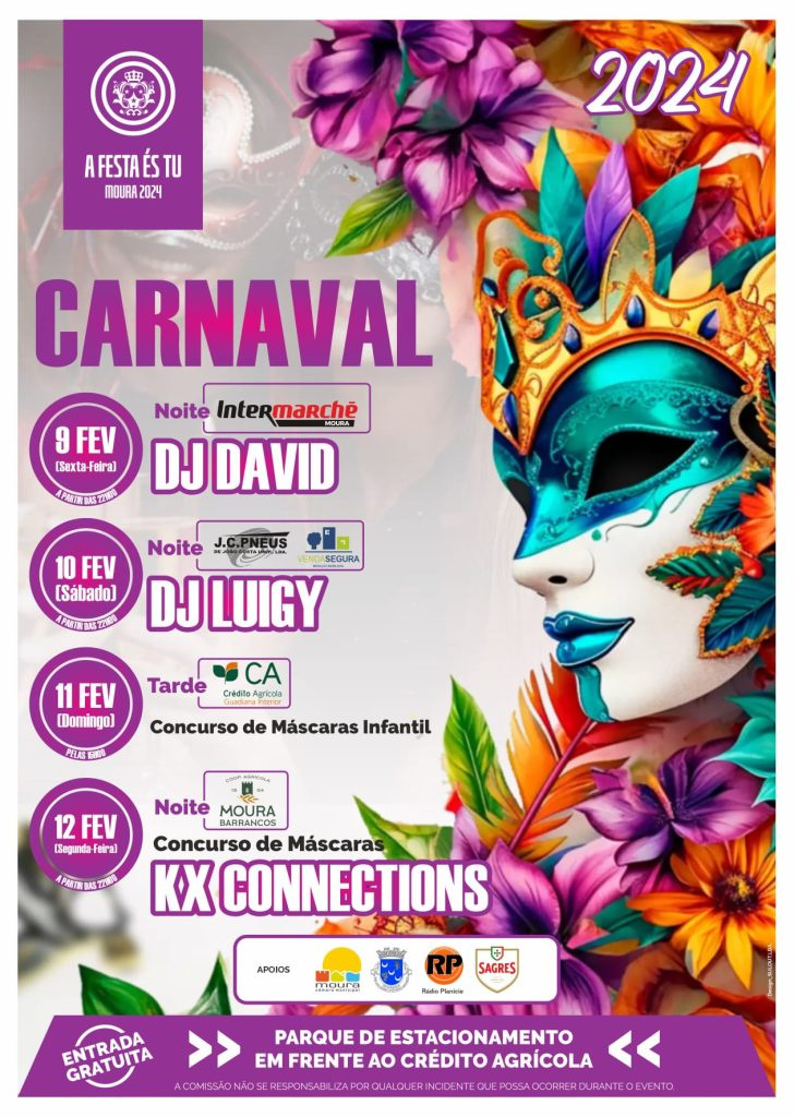 O 1ª encontro organizado pela Comissão de Festas de Moura 2024 está agendado para o Carnaval de 09 a 12 de fevereiro no Parque de Estacionamento em frente ao Crédito Agrícola, e à semelhança do que foi feito o ano passado, irá contar com muita música, os petiscos que deixaram saudades e dois desfiles de máscaras, um direccionado para o público infantil e outro para quem quiser mostrar o traje mais original.