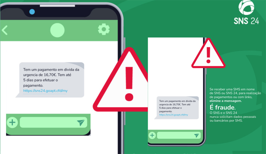 Trata-se de um esquema de mensagens falsas por SMS (conhecido como smishing), em que são utilizadas entidades credíveis, como o SNS e o SNS 24, com o intuito de induzir os destinatários a fornecerem informações pessoais e bancárias, com o objectivo de obtenção de vantagem financeira.