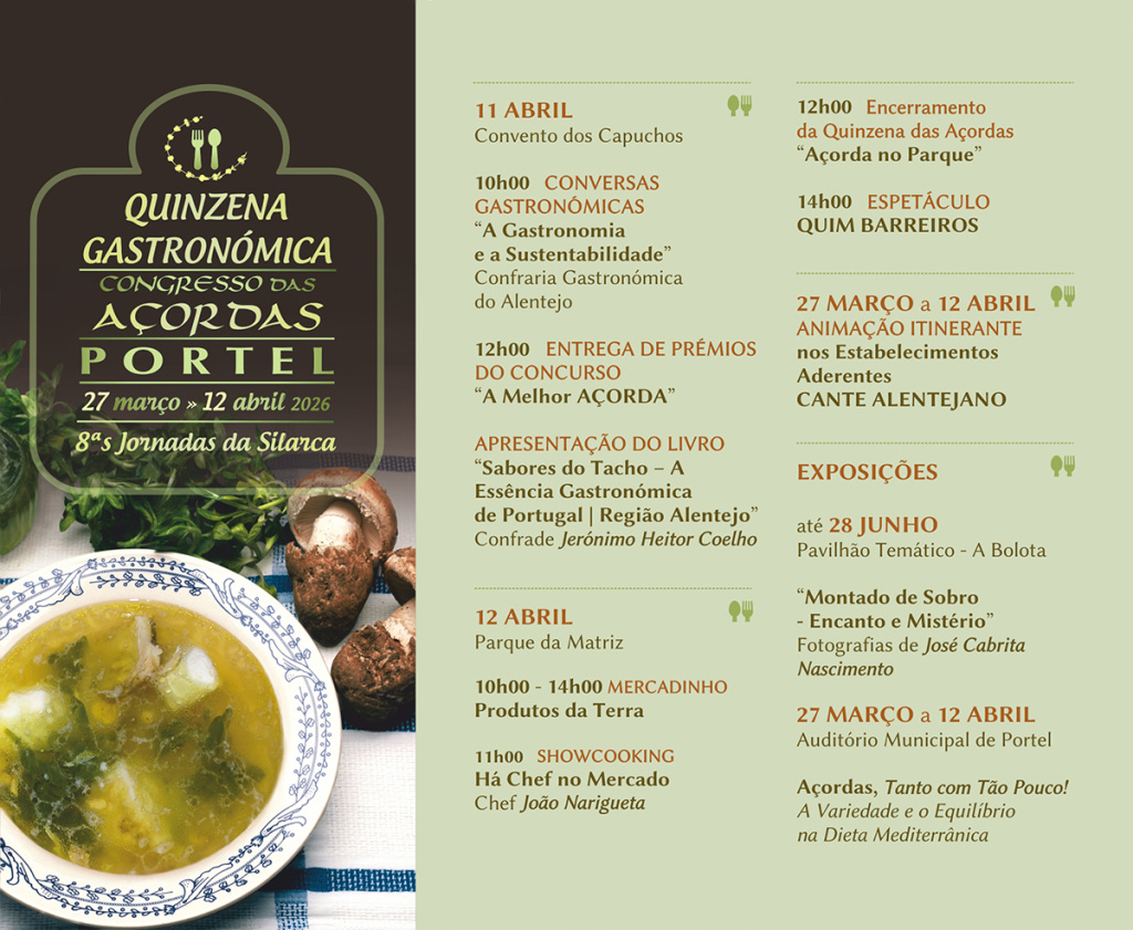De 27 de março a 12 de abril, esperam-se dias de sabores únicos e tradicionais, conjugados com diferentes temáticas apresentadas em workshops, conversas, o concurso da melhor açorda, passeios que vão permitir aos visitantes e locais descobrir as silarcas (cogumelo) que crescem no montado, showcookings de culinária com a participação de diferentes chefs para momentos únicos de degustação, e claro, Cante Alentejano.