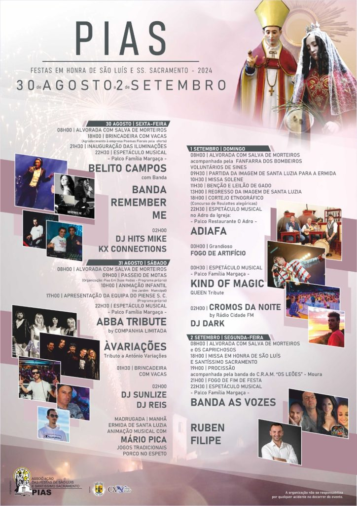 Conhecida como “Festa Rija”, as Festa de Pias em Honra de São Luís e do Santíssimo Sacramento, estão de volta à freguesia do concelho de Serpa entre os dias 30 de agosto e 2 de setembro. Um cartaz diversificado com músicas e actividades para todos os gostos e horários, desde a alvorada até à madrugada.