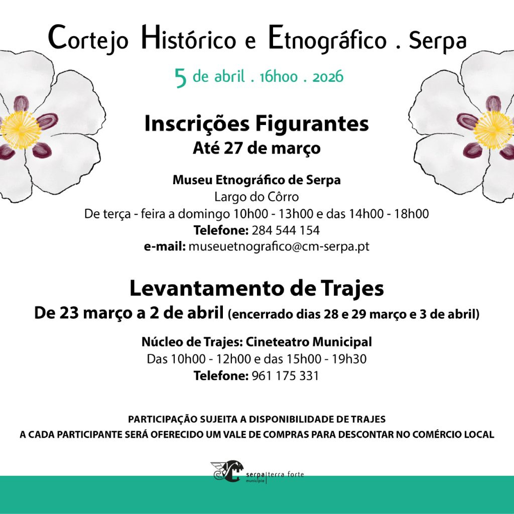 O Cortejo Histórico e Etnográfico de Serpa já tem a data definida para dia 5 de abril, pelas 16h00, mas as inscrições para participação como figurante decorrem até dia 27 de março e estão sujeitas à disponibilidade de traje. Dirija-se ao Museu Etnográfico de Serpa (Largo do Côrro), de terça-feira a domingo, das 10h00 às13h00 e das 14h00 às 18h00. Telefone 284 544 154; e-mail museuetnografico@cm-serpa.pt