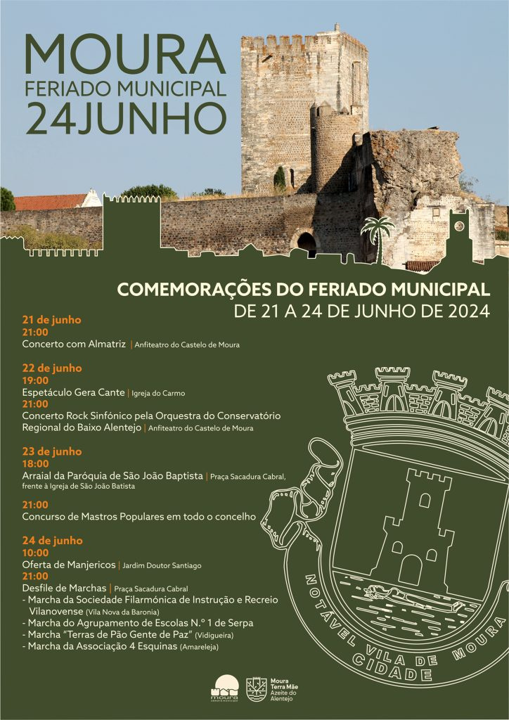 O Feriado Municipal é assinalado no dia 24 de junho, no concelho de Moura, mas o programa das comemorações inicia-se hoje, dia 21, à noite, com o concerto do grupo Almatriz, no anfiteatro do Castelo de Moura, às 21h00.