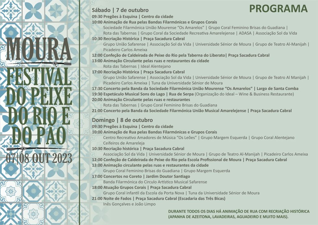 O Festival do Peixe do Rio e do Pão, organizado pela Câmara de Moura e por várias entidades parceiras, realiza-se este fim de semana, 07 e 08, com vários pontos de interesse pela cidade (ver cartaz).