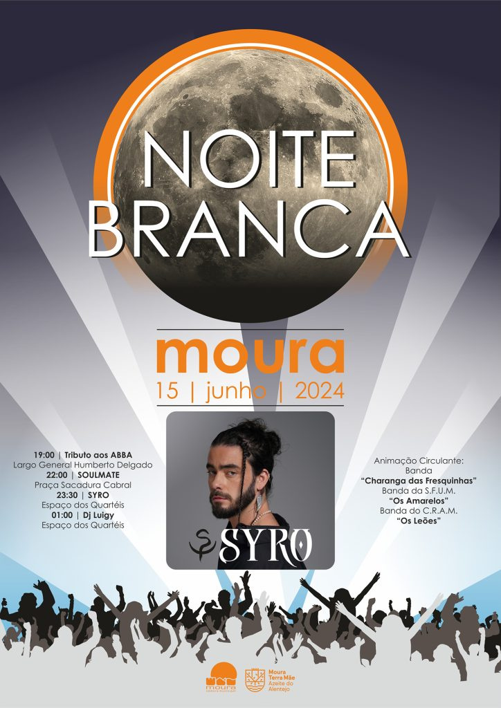 A cidade de Moura ganha uma nova vida este sábado, dia 15, com a realização da 4ª edição da Noite Branca. O Tributo aos ABBA abre este evento único às 19h00, no Largo General Humberto Delgado, em Moura. Às 22h00, os Soulmate sobem ao palco na Praça Sacadura Cabral e às 23h30, no espaço dos Quartéis, SYRO é o grande nome da Noite Branca, onde se esperam algumas surpresas. A música num registo diferente, continua neste espaço com o DJ Luigy, a partir da 01h00.